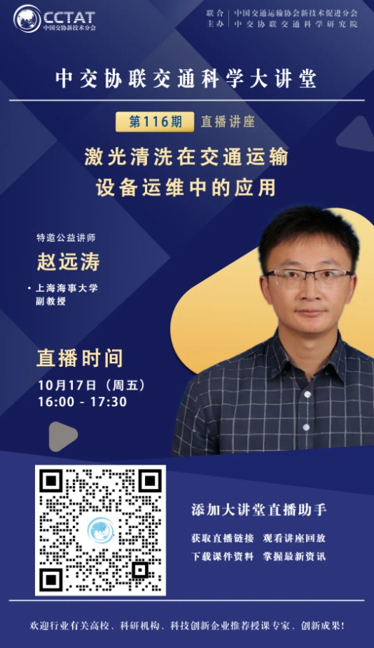 直播預(yù)告 | 中交協(xié)聯(lián)交通科學(xué)大講堂第117期:趙遠(yuǎn)濤《激光清洗在交通運(yùn)輸設(shè)備運(yùn)維中的應(yīng)用》